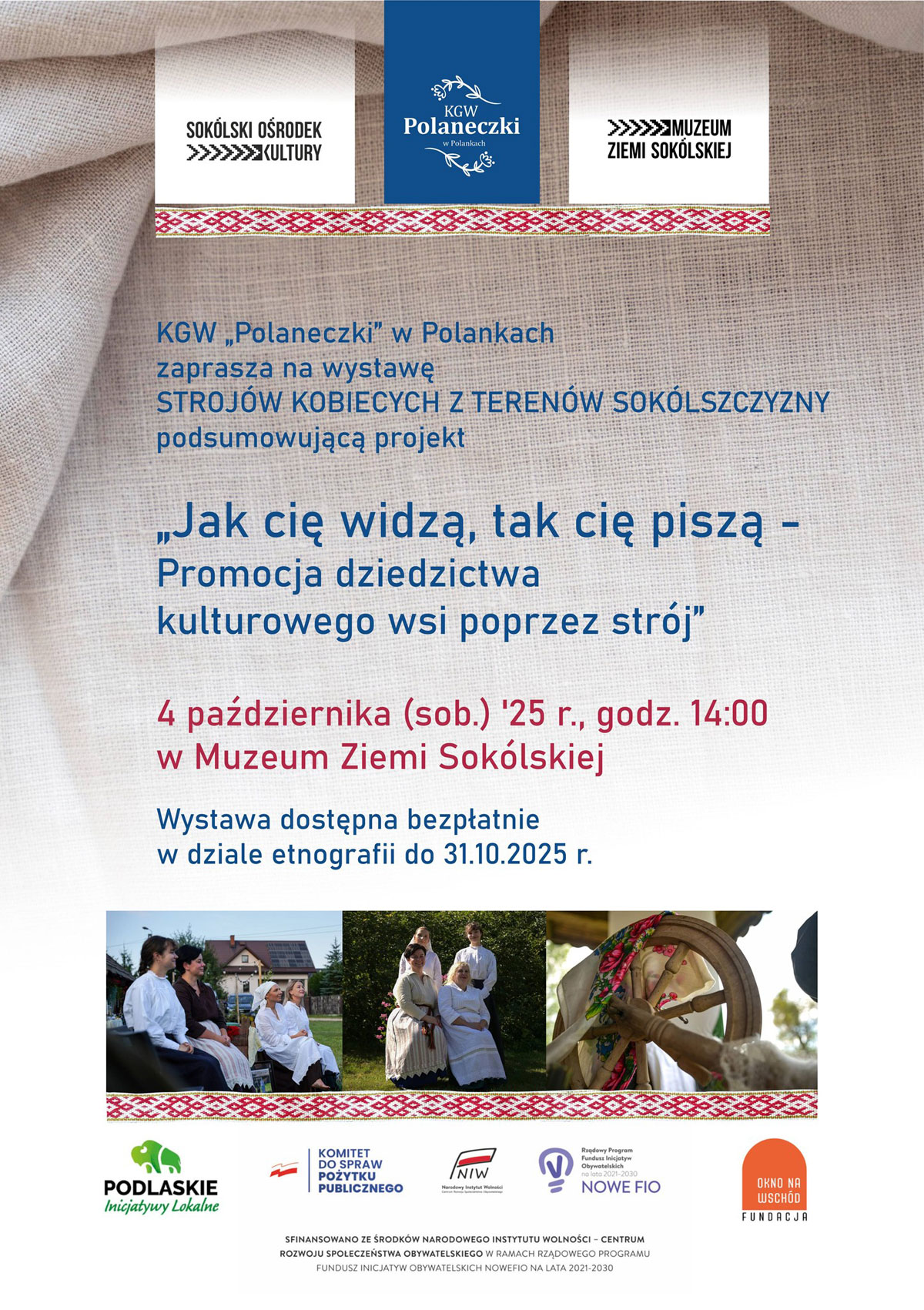 Koło Gospodyń Wiejskich „Polaneczki” w Polankach wraz z Muzeum Ziemi Sokólskiej Sokólskiego Ośrodka Kultury zapraszają na zakończenie projektu „Jak cię widzą tak cię piszą – promocja dziedzictwa kulturowego wsi poprzez strój”.