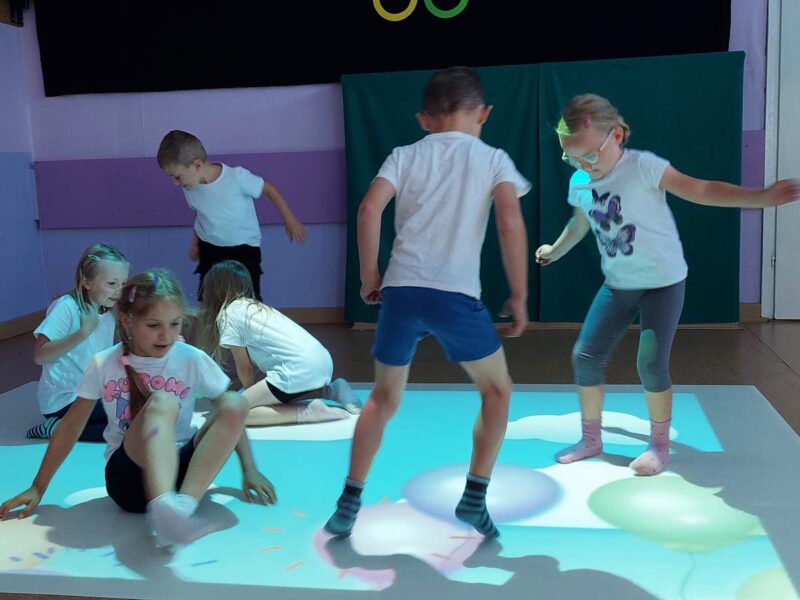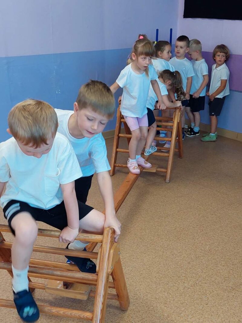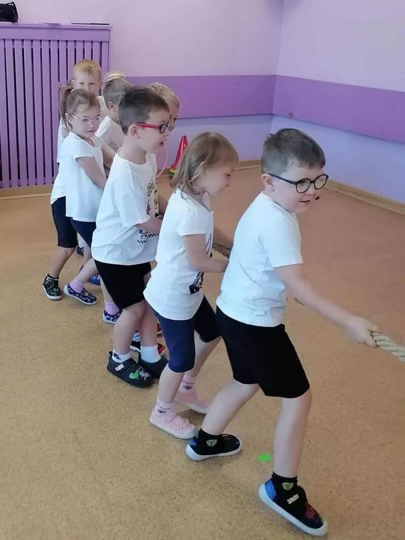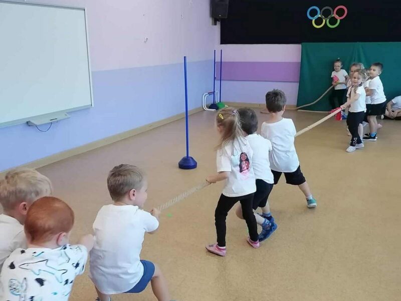 Przedszkolaki brały udział w różnorodnych aktywnościach: biegi, ćwiczenia gimnastyczne, przeciąganie liny, tory przeszkód, zabawy na magicznym dywanie co rozwija ich sprawność motoryczną, koordynację i zwinność.