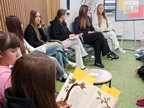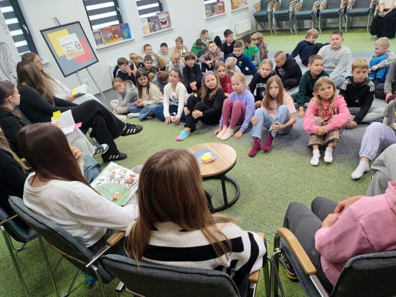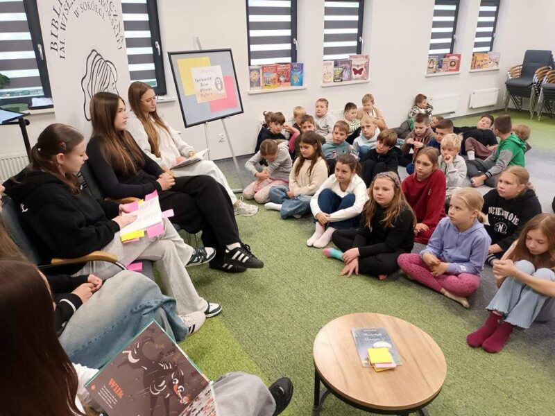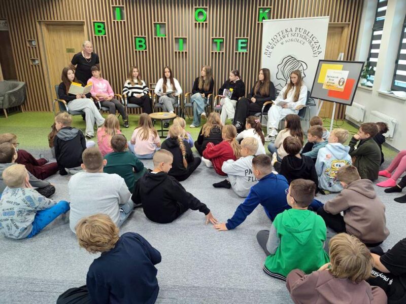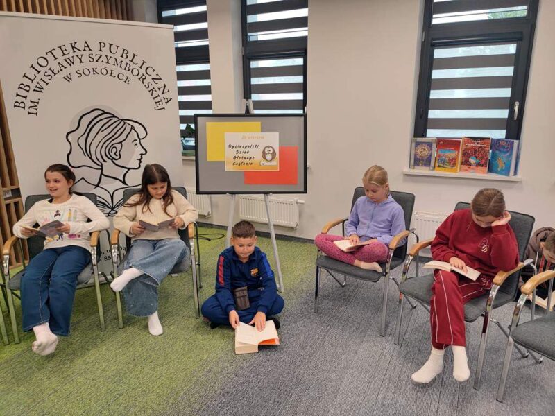 W tym dniu Oddział dla Dzieci i Młodzieży Biblioteki Publicznej im. Wisławy Szymborskiej w Sokółce odwiedziły uczennice klas pierwszych Zespołu Szkół w Sokółce Liceum Ogólnokształcącego im. Mikołaja Kopernika, które pod czujnym okiem swych nauczycielek, pani prof. Małgorzaty Kułakowskiej i pani prof. Jolanty Zielenkiewicz przygotowały dla swych młodszych koleżanek i kolegów z klas trzecich Szkoły Podstawowej z Oddziałami Integracyjnymi nr 2 wspaniałe słuchowisko złożone z nietypowych, ale wciągających i angażujących poczytanek. Teksty stanowiły wyzwanie, zarówno dla samych czytających, jak i zapraszały dzieci do zmierzenia się z niuansami artykulacyjnymi oraz nieoczywistościami narracyjnymi.