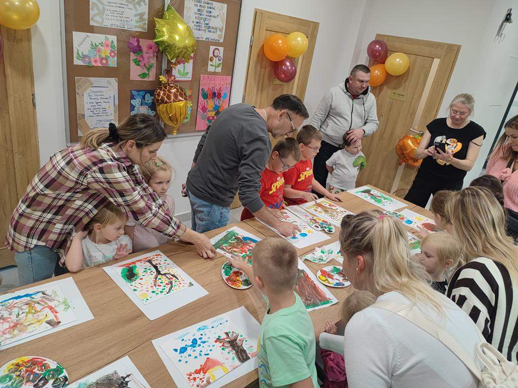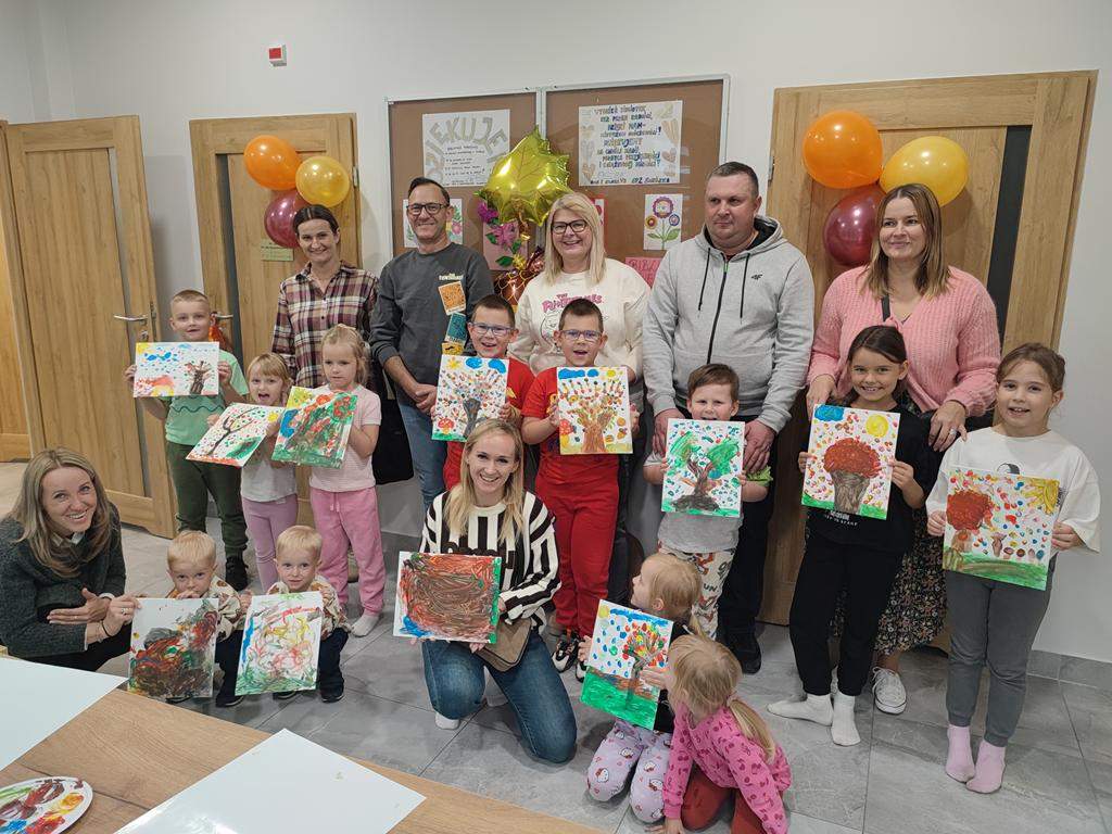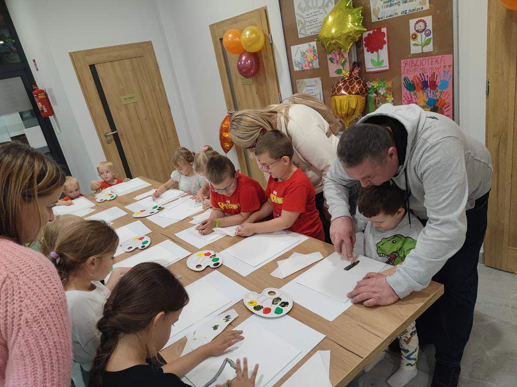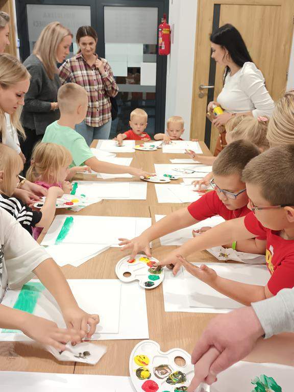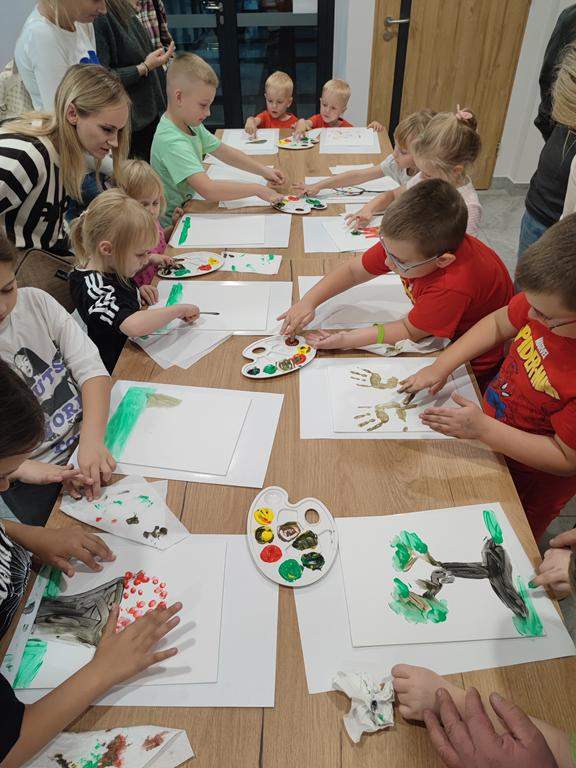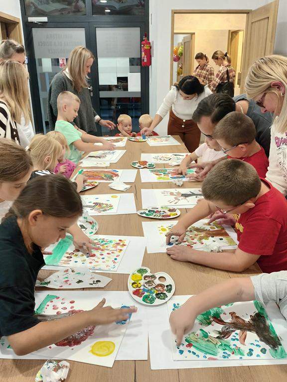 Spotkanie rozpoczęło się od wspólnego wysłuchania i obejrzenia na ekranie bajki Joanny Papuzińskiej „Jesienna przygoda”, która wprowadziła uczestników w klimat tej pory roku. Po wspólnej lekturze, dzieci i ich rodzice stanęli przed nie lada wyzwaniem! Przy pomocy farb i… własnych paluszków! Jakież się one okazały zwinne i pomysłowe. Obrazy, które tworzyły zdolne rodziny były wyjątkowe, piękne i bardzo dobrze oddawały klimat jesieni.