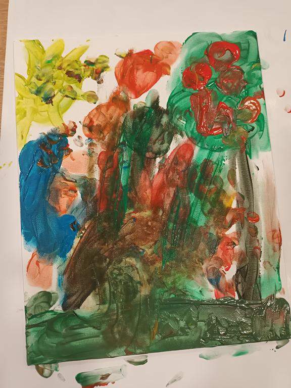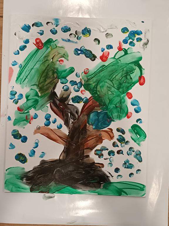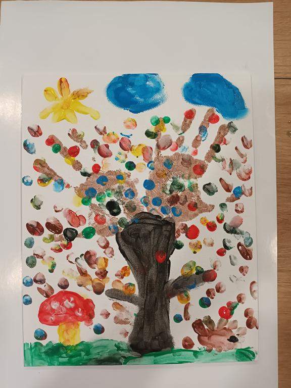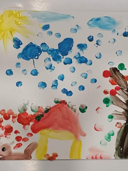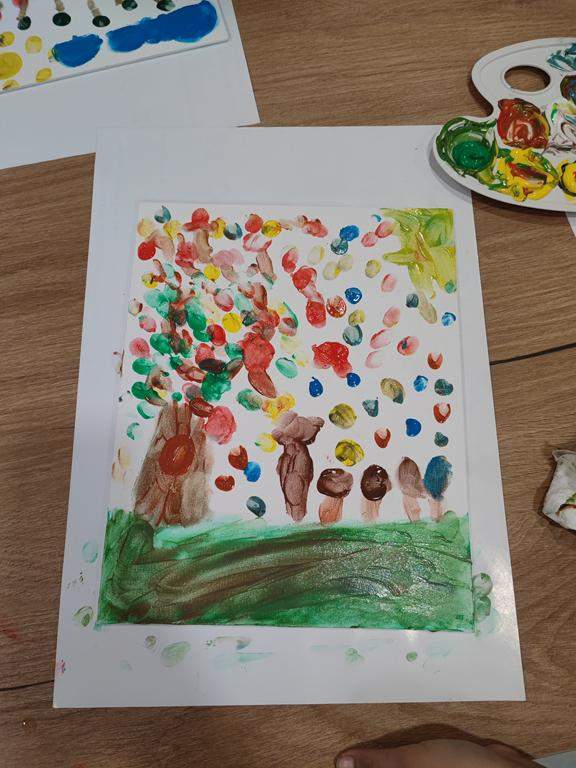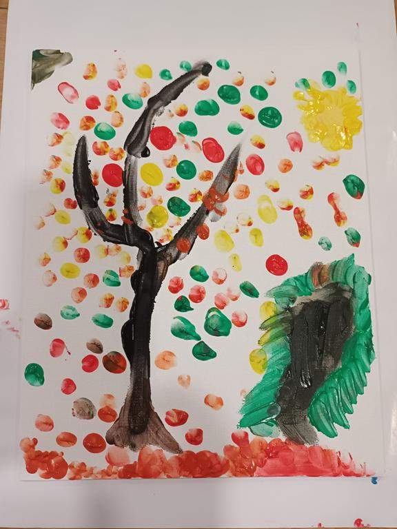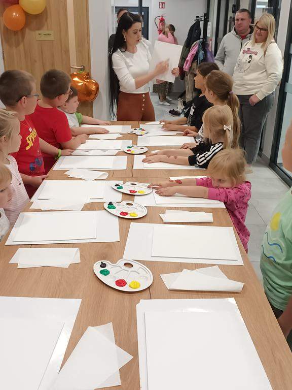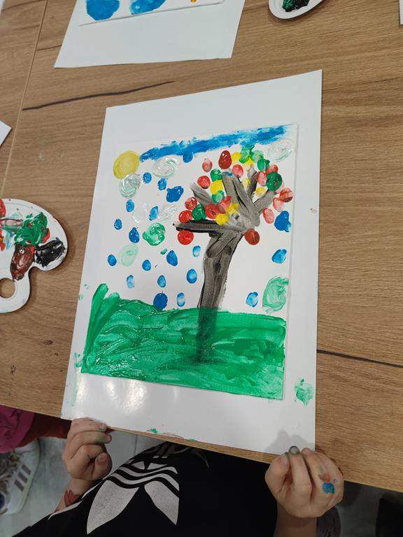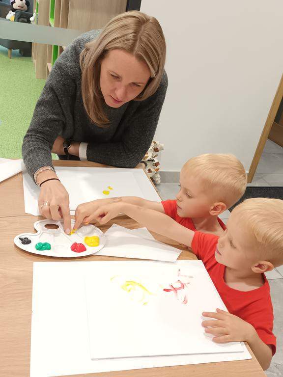 Spotkanie rozpoczęło się od wspólnego wysłuchania i obejrzenia na ekranie bajki Joanny Papuzińskiej „Jesienna przygoda”, która wprowadziła uczestników w klimat tej pory roku. Po wspólnej lekturze, dzieci i ich rodzice stanęli przed nie lada wyzwaniem! Przy pomocy farb i… własnych paluszków! Jakież się one okazały zwinne i pomysłowe. Obrazy, które tworzyły zdolne rodziny były wyjątkowe, piękne i bardzo dobrze oddawały klimat jesieni.