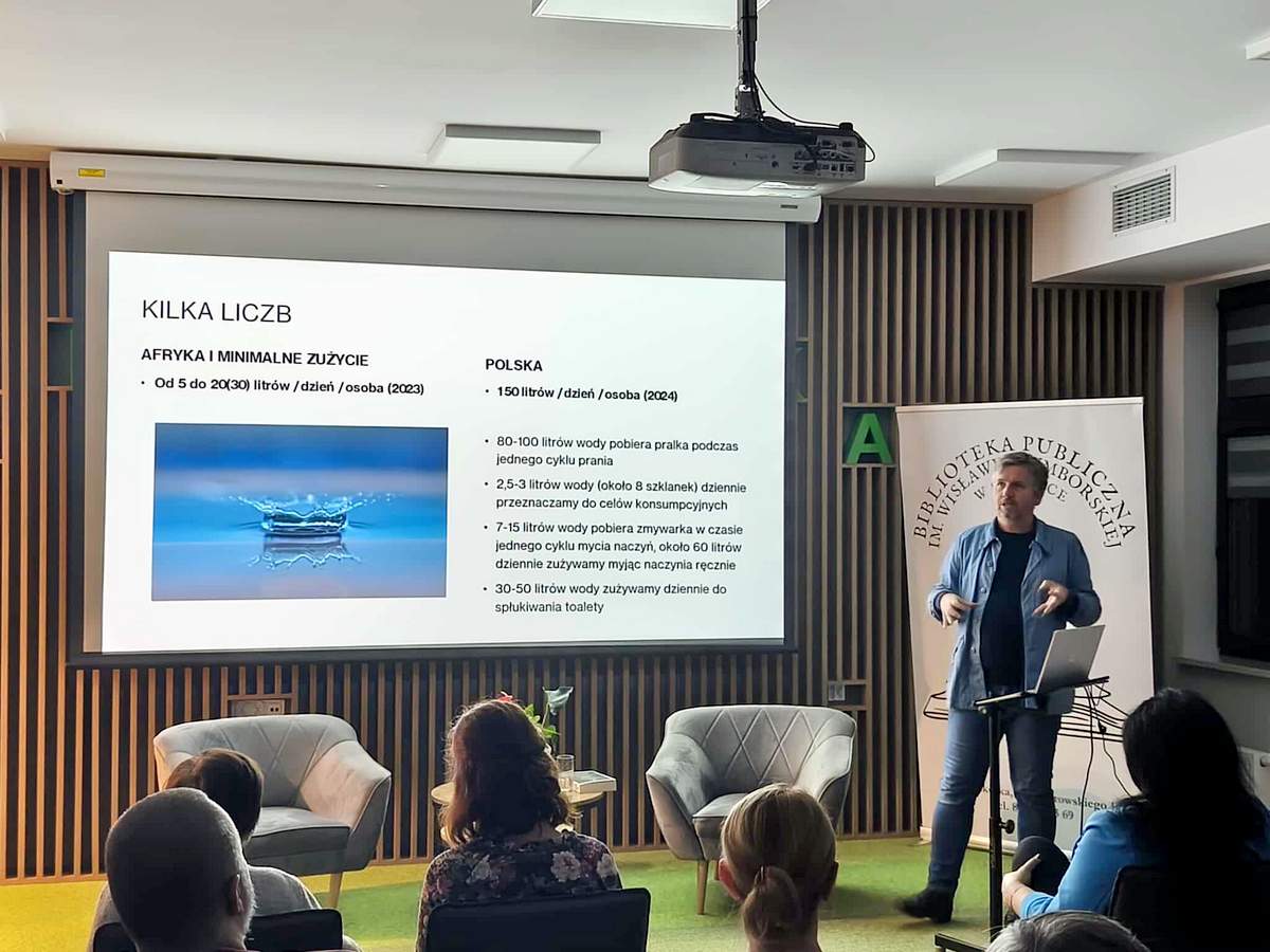 Na sali zgromadzili się nie tylko zainteresowani tematem mieszkańcy, ale również czytelnicy i bohaterowie książek Pana Pawła. Swoje wystąpienie prelegent rozpoczął od danych dotyczących zużycia wody, o tym jak klasyfikujemy susze oraz jaki stan wód mamy teraz. Podane definicje i liczby poparł własnymi zdjęciami tych samych miejsc na przestrzeni 2-3 lat. Wnioski i perspektywa przyszłości nie napawają optymizmem, dlatego też drugą częścią wykładu było przedstawienie sposobów jak zmniejszyć zużycie wody w domu oraz zatrzymać ją na posesji wokół niego.
