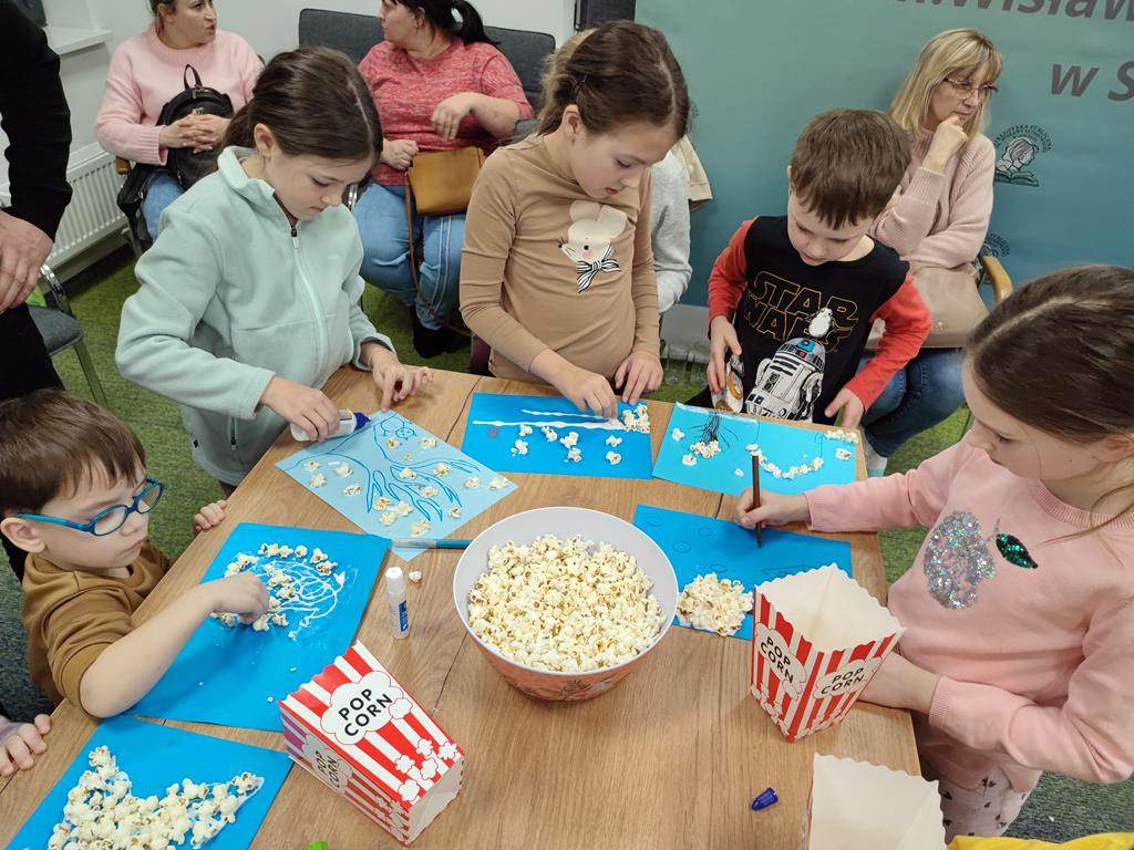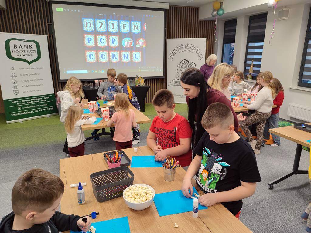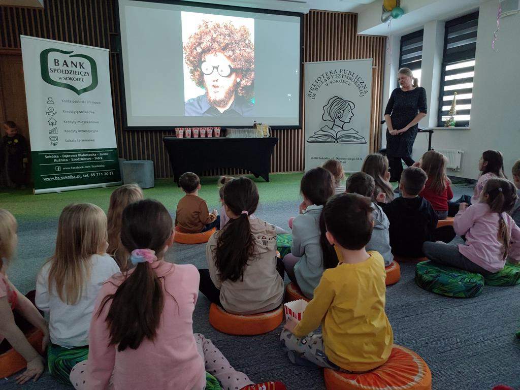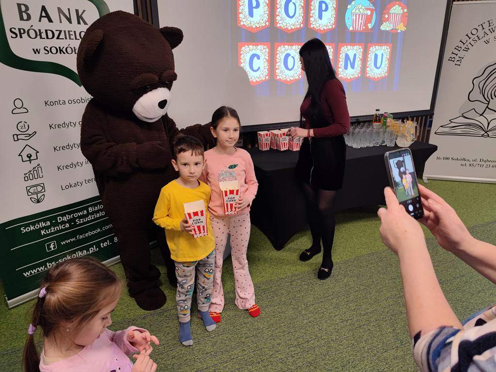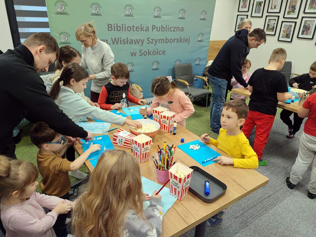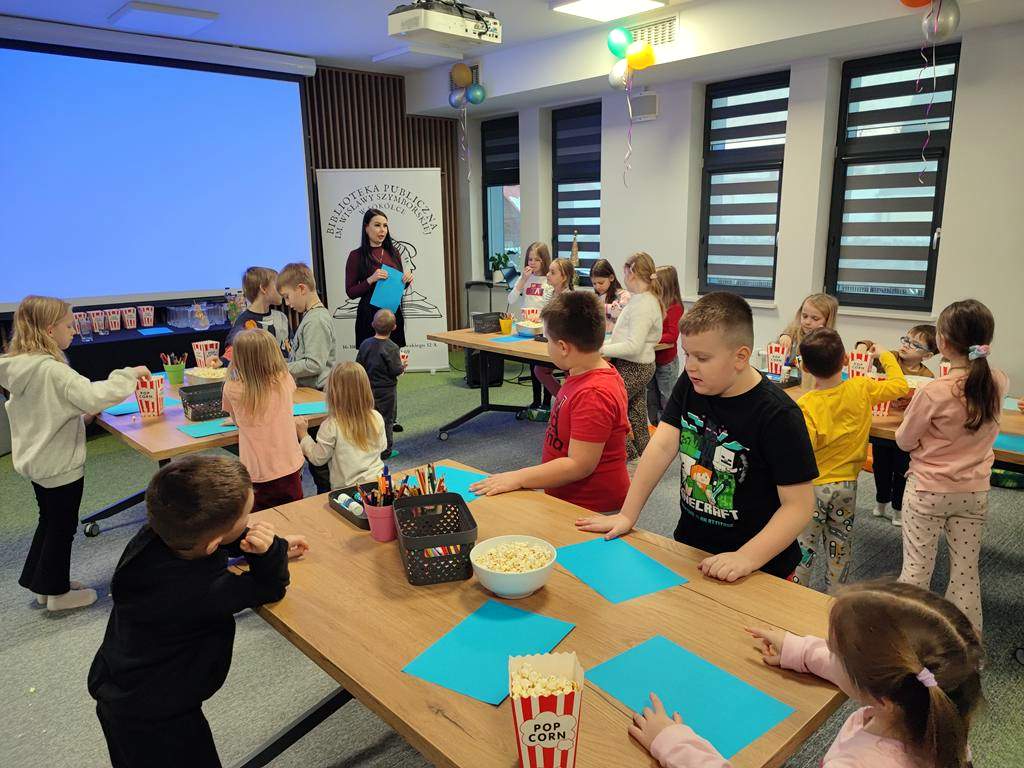 W 2026 roku Oddział dla Dzieci i Młodzieży „Ferie z biblioteką” rozpoczął, można by rzec, „na chrupiąco”, gdyż 19 stycznia był „Dniem Popcornu”, co stało się inspiracją do przygotowania dla dzieci bibliotecznego kina. Jak przystało jednak na tego rodzaju placówkę, goście nie oglądali filmu, a wspólnie oglądali i słuchali, a także aktywnie tworzyli historię, która okazała się opowieścią o zwariowanym dniu pewnej (a jakże!) bibliotekarki.