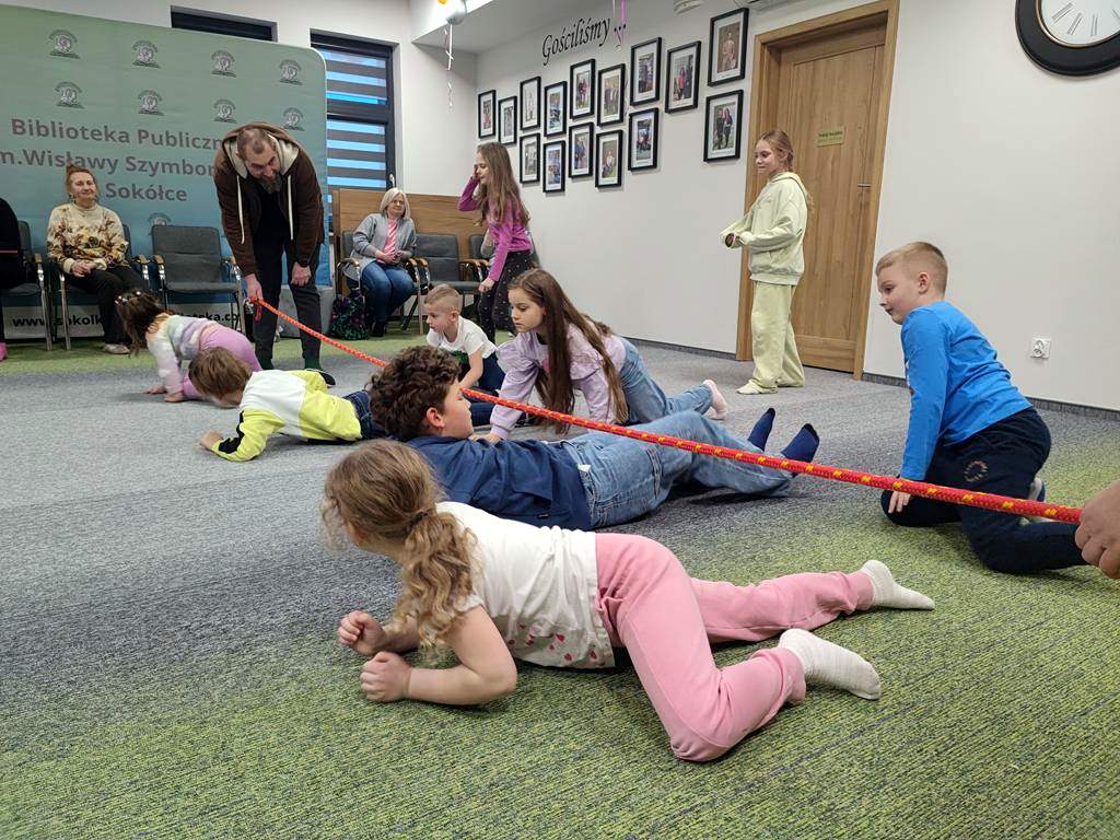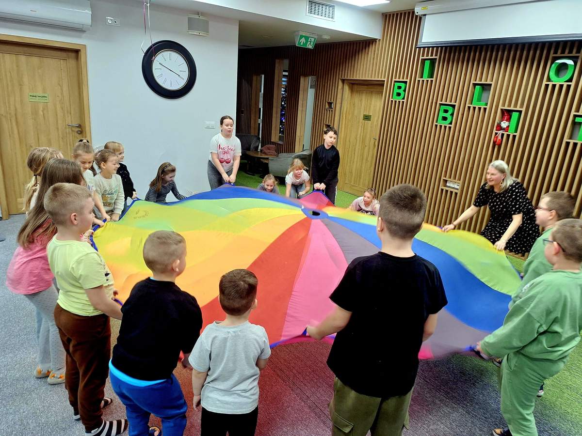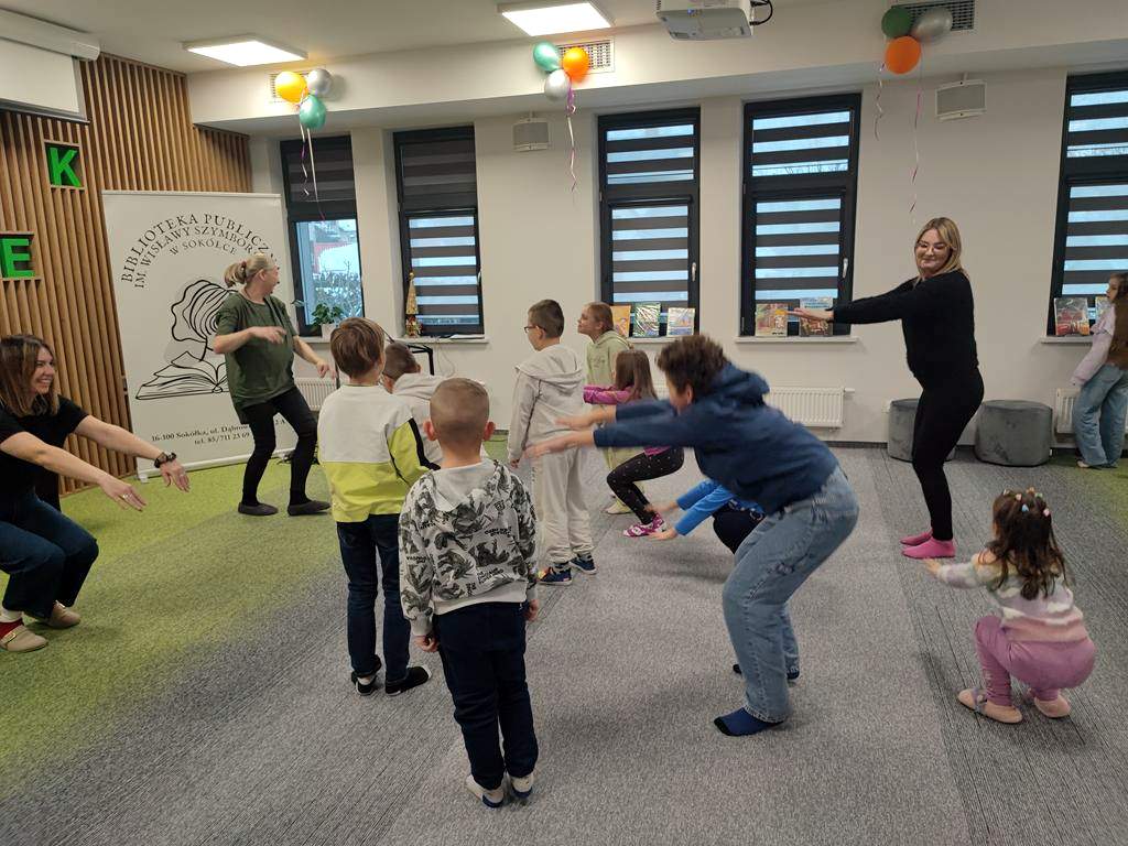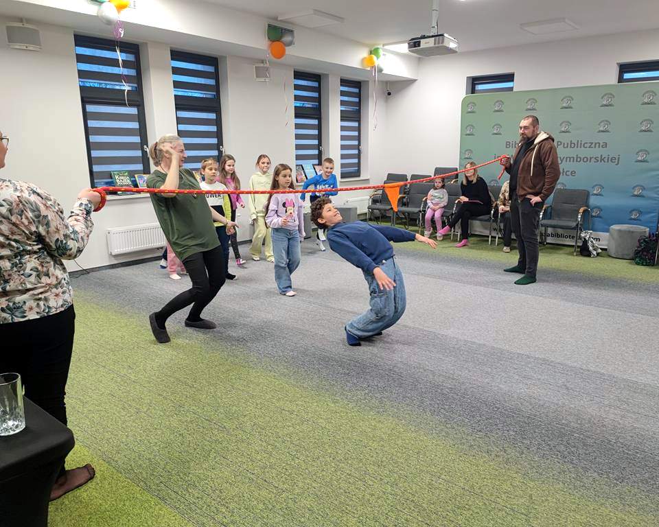 W poniedziałek uczestnicy wykonali „Skok na czytanie”! Było dużo ruchu inspirowanego wierszami o tematyce sportowej, a wszystko po to, by udoskonalić swoją formę do szalonej zabawy, jaką jest bajka-bieganka. Młodzi goście nie tylko wysłuchali baśni, ale i w niej uczestniczyli. W historii pt.: „Zaginiona bibliotekarka” słuchacze stają się bohaterami, co przysparza wielu emocji i sprawia, że czytanie to wielka przygoda i wspaniała zabawa.