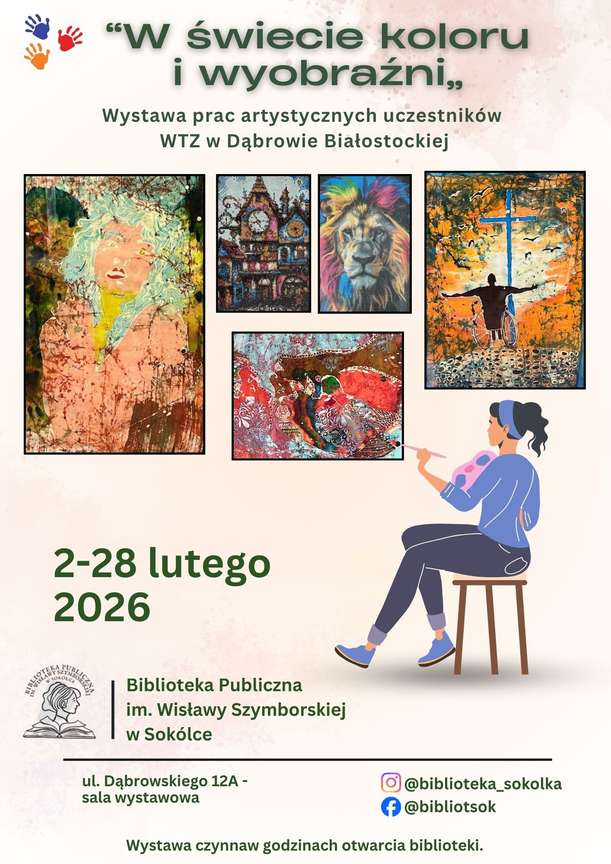 Biblioteka Publiczna im. Wisławy Szymborskiej w Sokółce serdecznie zaprasza na wystawę prac artystycznych uczestników Warsztatów Terapii Zajęciowej w Dąbrowie Białostockiej pod tytułem „W świecie koloru i wyobraźni”.