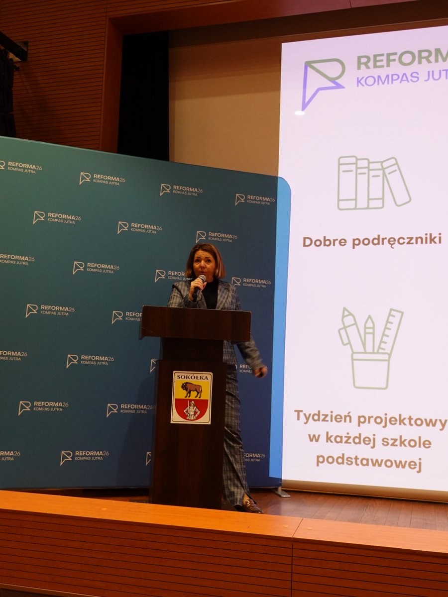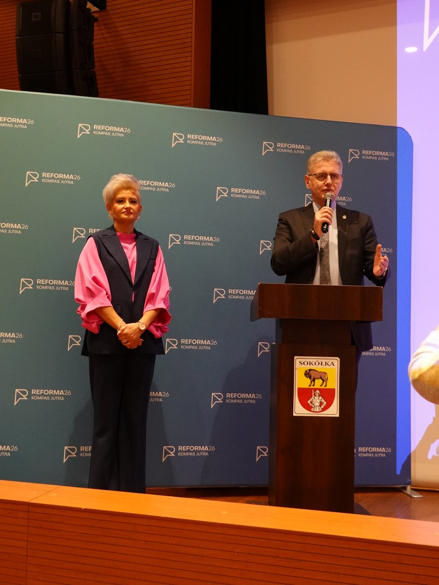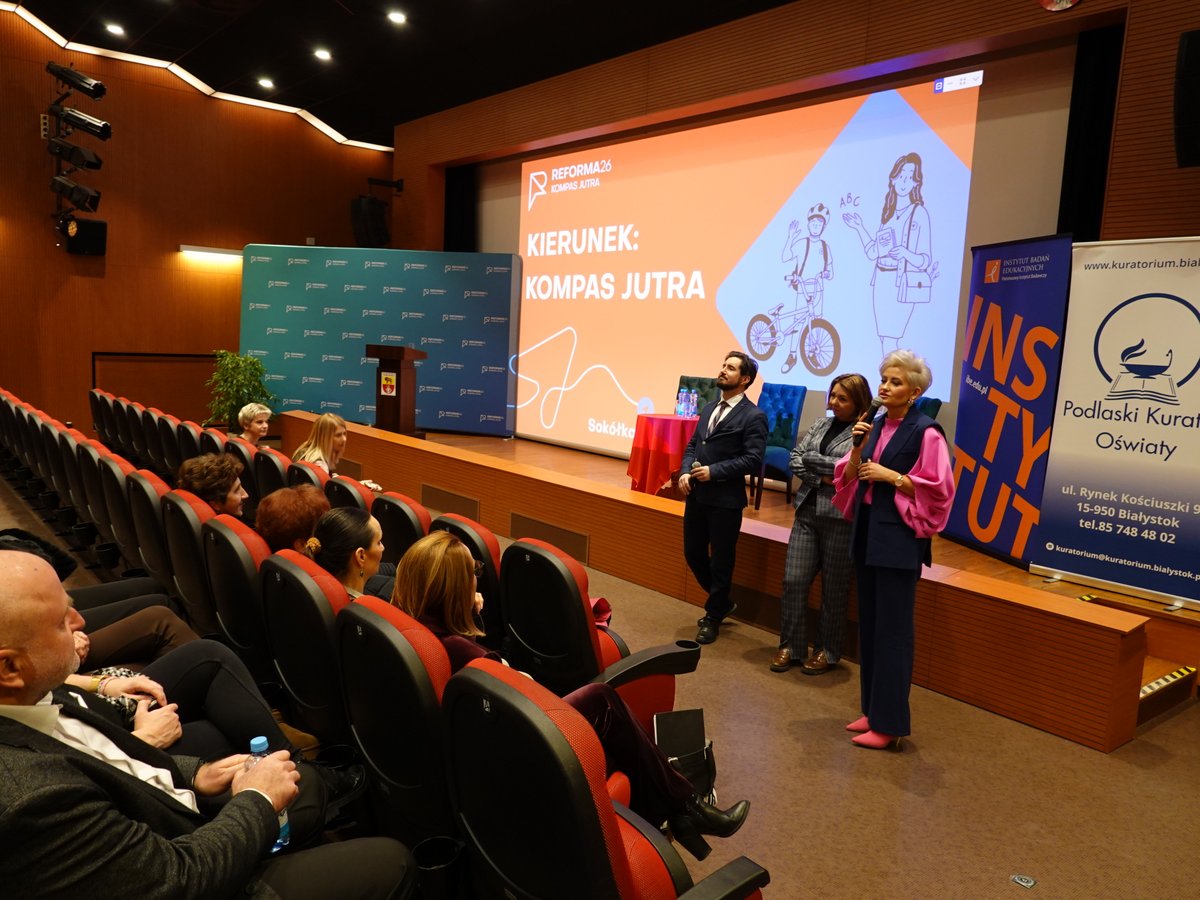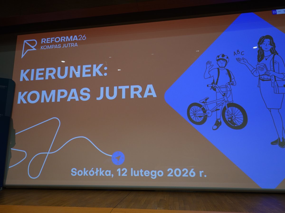Na zaproszenie Burmistrza Sokółki Ewy Kulikowskiej, 12 lutego 2026 roku w Sokółce, odbyło się ważne spotkanie w ramach trasy informacyjnej Ministerstwa Edukacji Narodowej pod nazwą „Kompas Jutra” – cykl konferencji, których celem jest zaprezentowanie i przedyskutowanie założeń nowej reformy edukacji Reforma26 „Kompas Jutra”.
