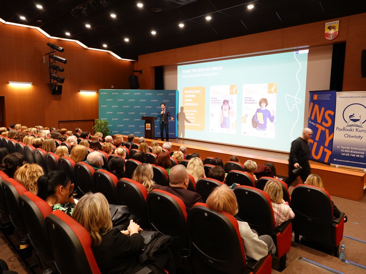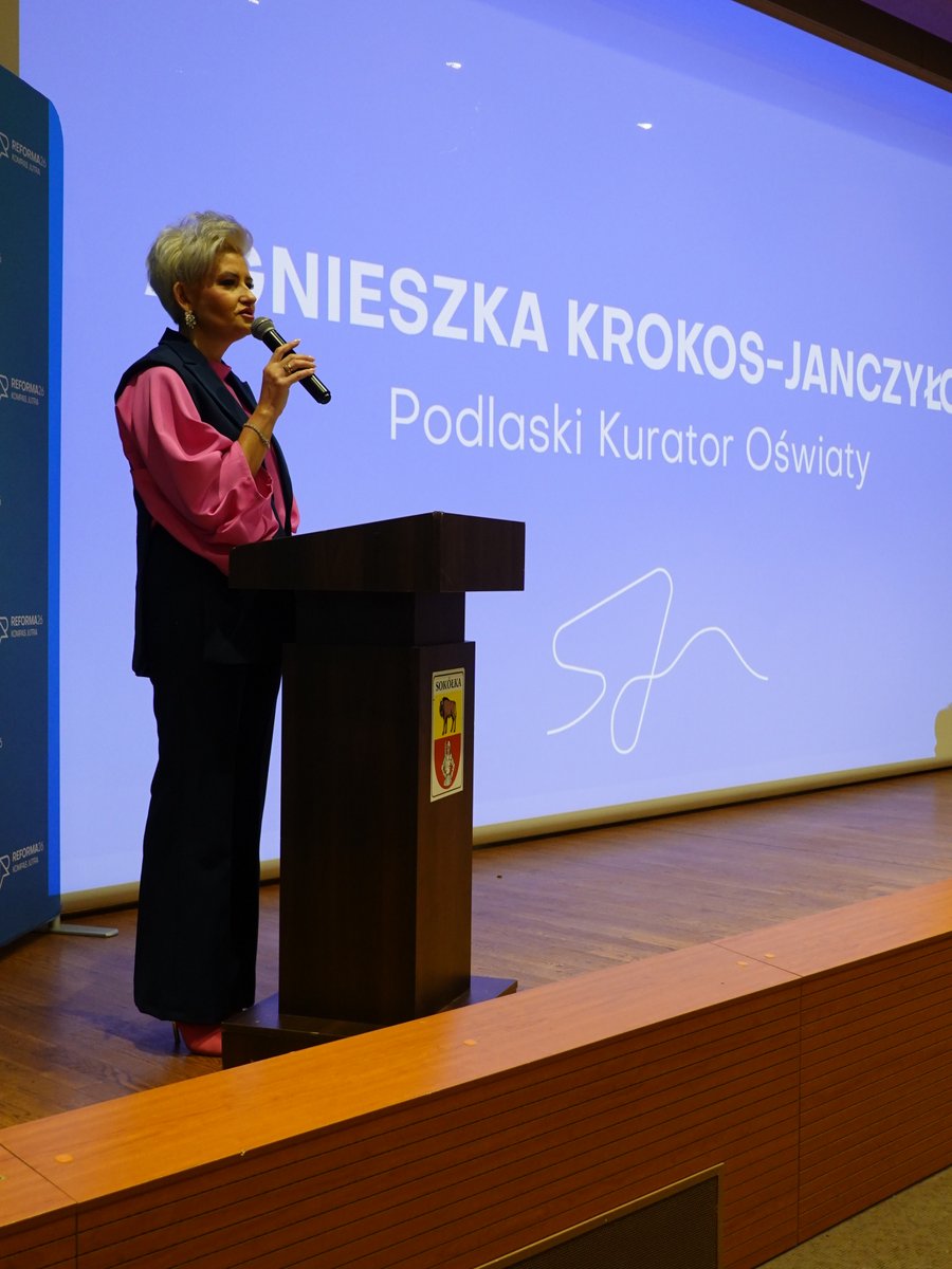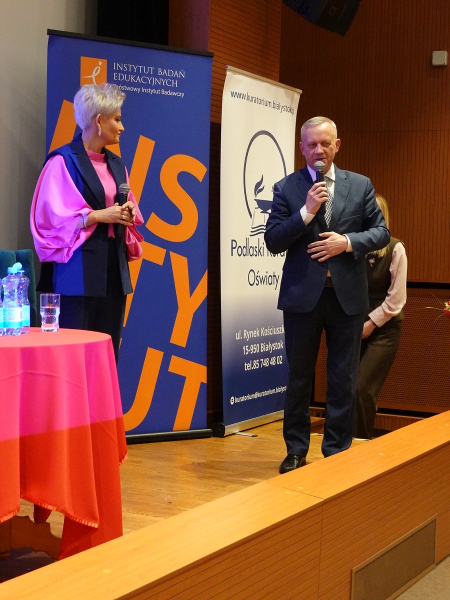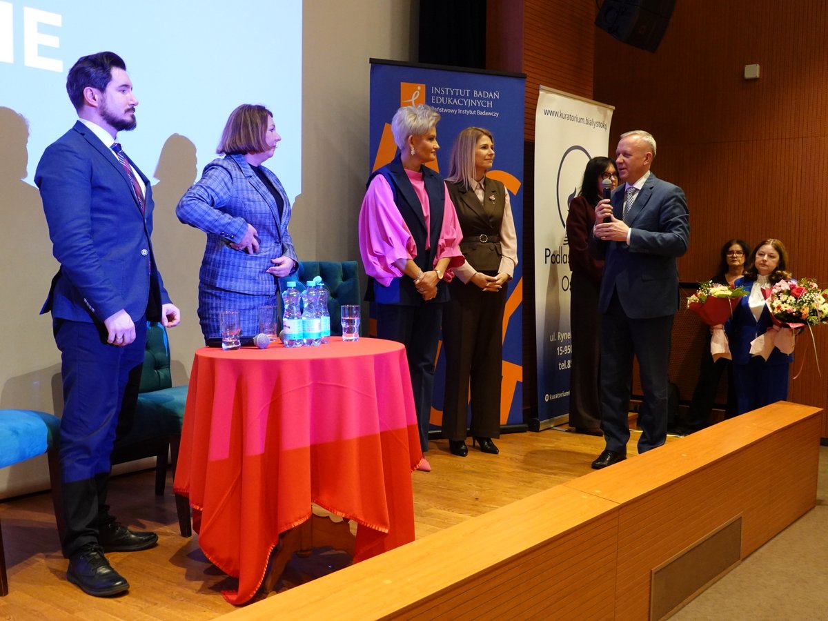 Konferencję prowadziły Izabela Ziętka – Podsekretarz stanu Ministerstwa Edukacji Narodowej, Agnieszka Krokos-Janczyło – Podlaski kurator oświaty, Marcin Marciniak-Mierzejewski – ekspert Instytutu Badań Edukacyjnych, Anna Stankiewicz – dyrektor Szkoły Podstawowej nr 28 w Białymstoku.