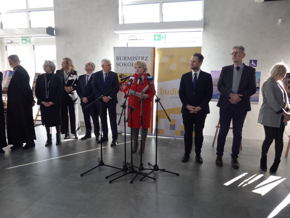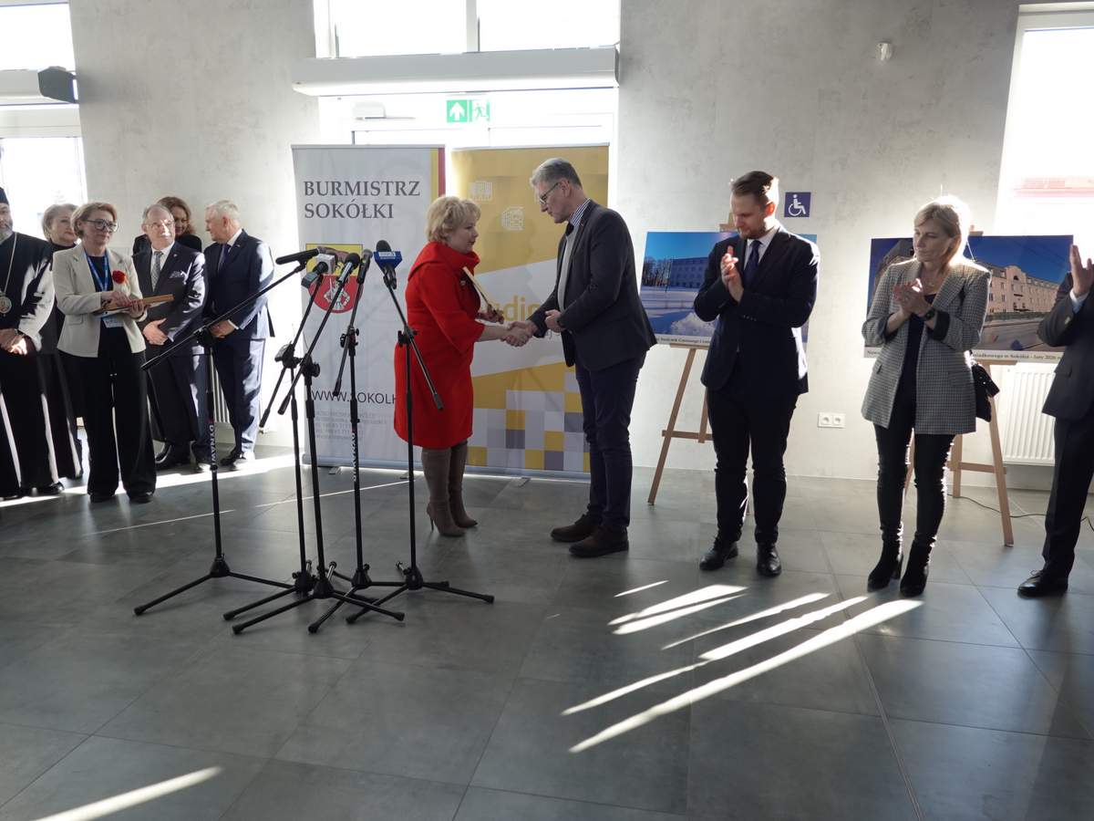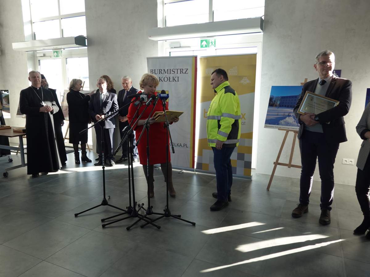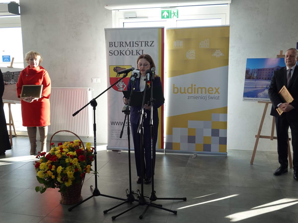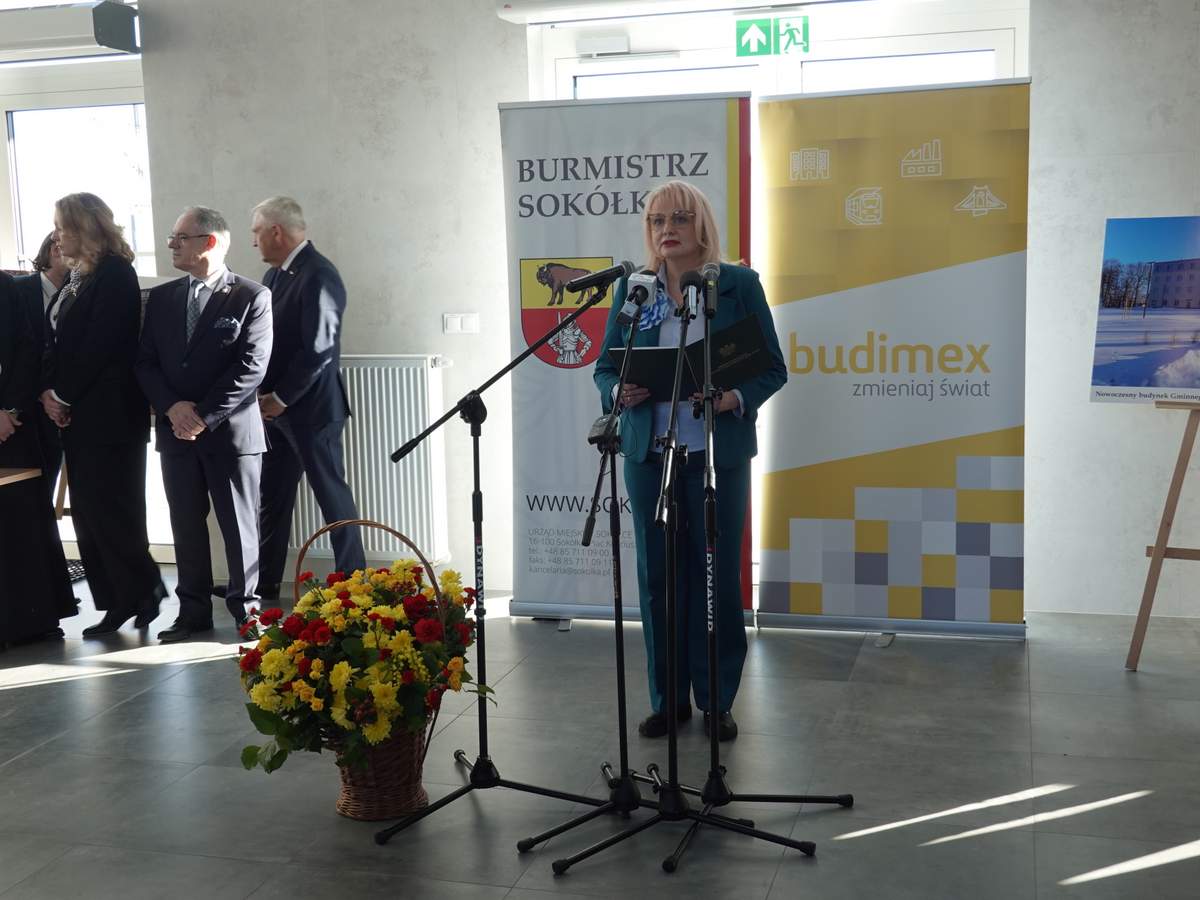 Po przecięciu wstęgi przed wejściem do budynku, uczestnicy uroczystości zgromadzili się w holu na parterze obiektu. Do zebranych zwróciła się Burmistrz Sokółki Ewa Kulikowska