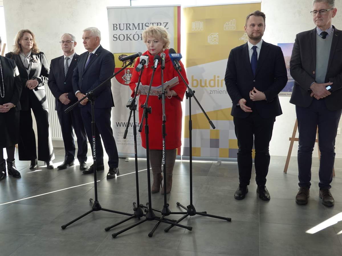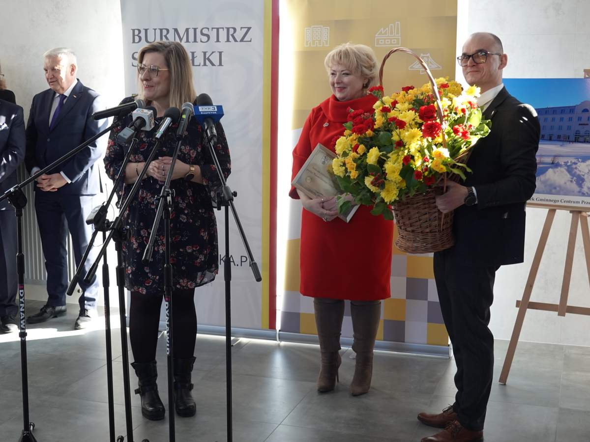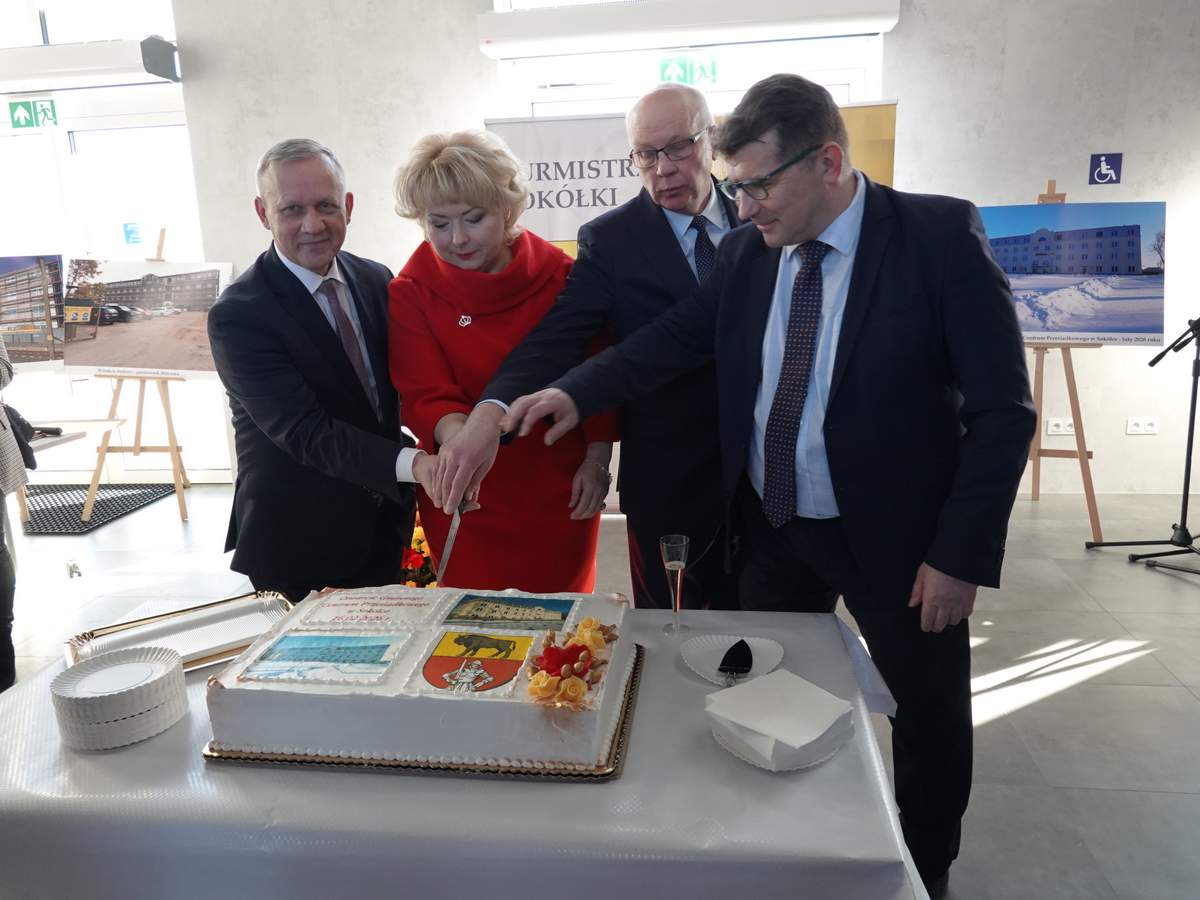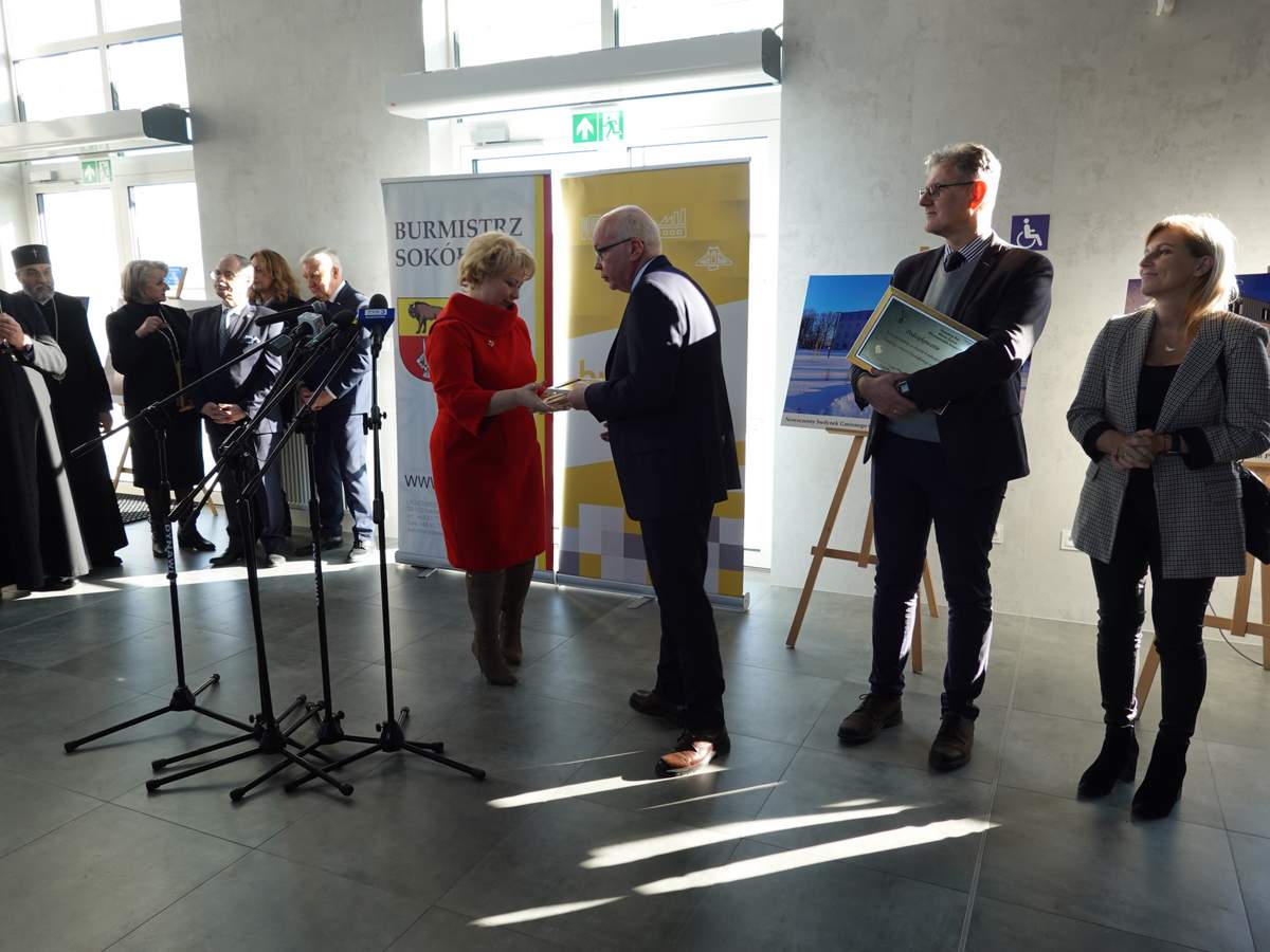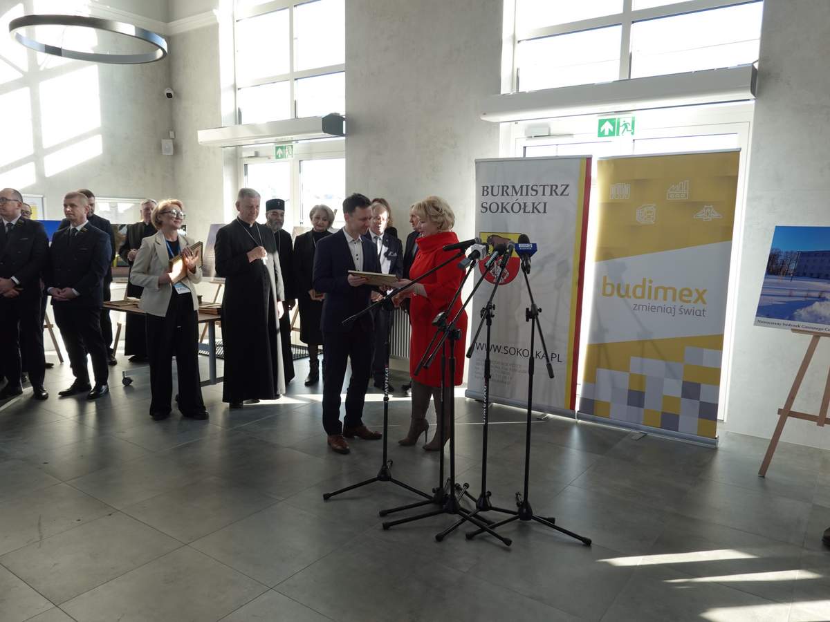 Po przecięciu wstęgi przed wejściem do budynku, uczestnicy uroczystości zgromadzili się w holu na parterze obiektu. Do zebranych zwróciła się Burmistrz Sokółki Ewa Kulikowska