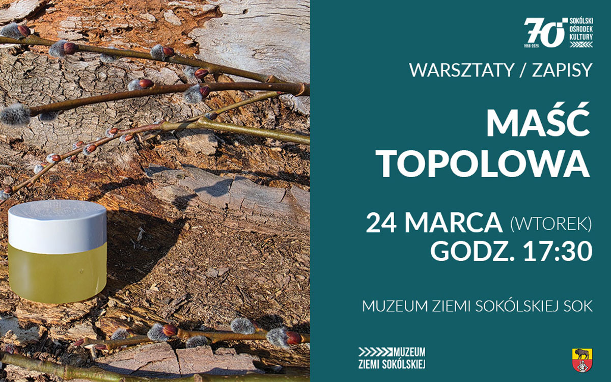 Wiosna to czas pączków, które wypuszczają drzewa i krzewy, a które moją w sobie ogromną siłę i moc leczniczą. 24 marca 2026 roku (wtorek) w Muzeum Ziemi Sokólskiej SOK na warsztat trafią pąki topoli, w których występuje bogactwo związków przeciwzapalnych, jak chociażby salicyna i jej pochodne. Ekstrakty topolowe stosowane zewnętrznie zmniejszają stan zapalny, a co za tym idzie, zmniejszają odczuwanie bólu. Dodatkowym plusem jest piękny zapach, jaki unosi się podczas maceracji pąków.