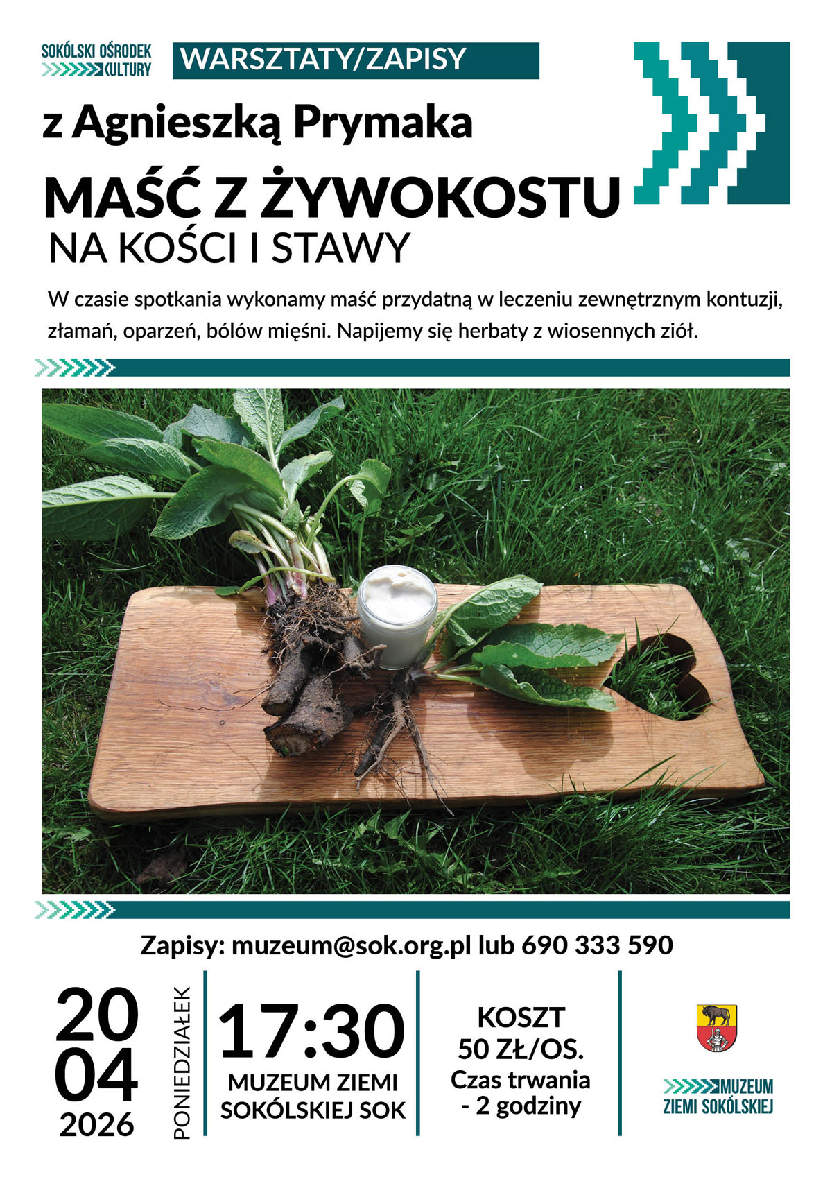 W poniedziałek, 20 kwietnia 2026 r. o godzinie 17:30, w Muzeum Ziemi Sokólskiej SOK (ul. Piłsudskiego 2), pod okiem doświadczonej zielarki, uczestnicy warsztatów wykonają maść żywokostową na wszelkie schorzenia kostno-stawowe. Takiej maści nie może zabraknąć w żadnej domowej apteczce!
