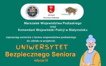 Zarząd Województwa Podlaskiego wraz z Komendą Wojewódzką Policji w Białymstoku prowadzi nabór do projektu pn. „Uniwersytet Bezpiecznego Seniora – III edycja”. Wszelkie niezbędne informacje znajdują się pod linkiem: https://podlaskie.eu/ Zgłoszenia przyjmowane są od 9 do 25 września 2025 roku. Należy je przesłać lub dostarczyć osobiście poprzez wypełniony i podpisany formularz … ZOBACZ WIĘCEJ